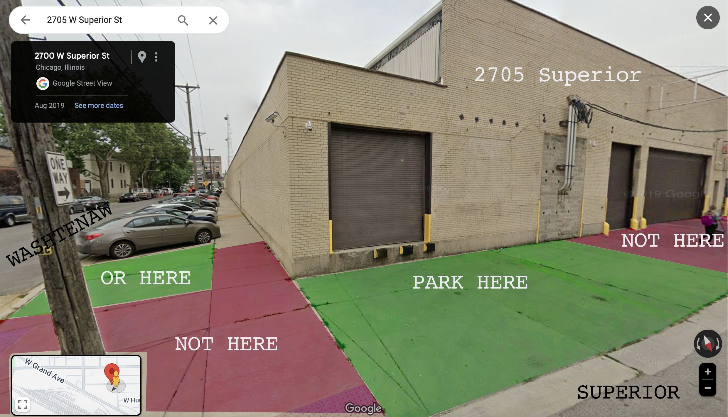 Please park behind the building at 2705 W Superior, as shown in this photo.