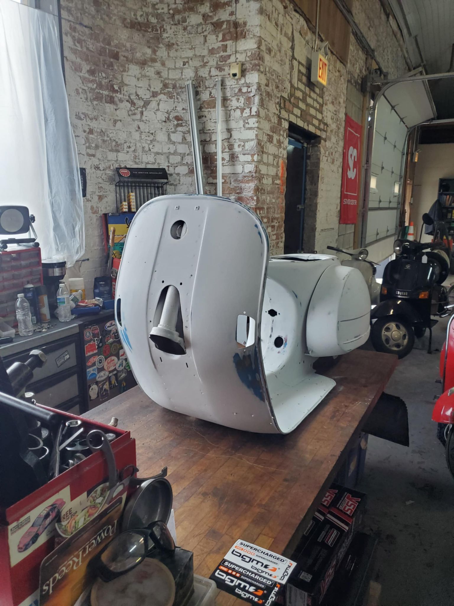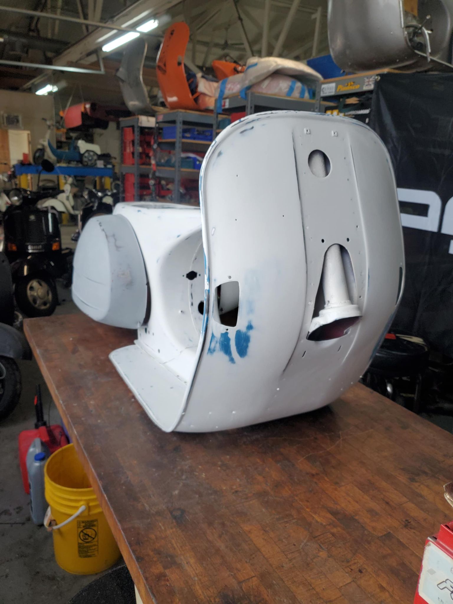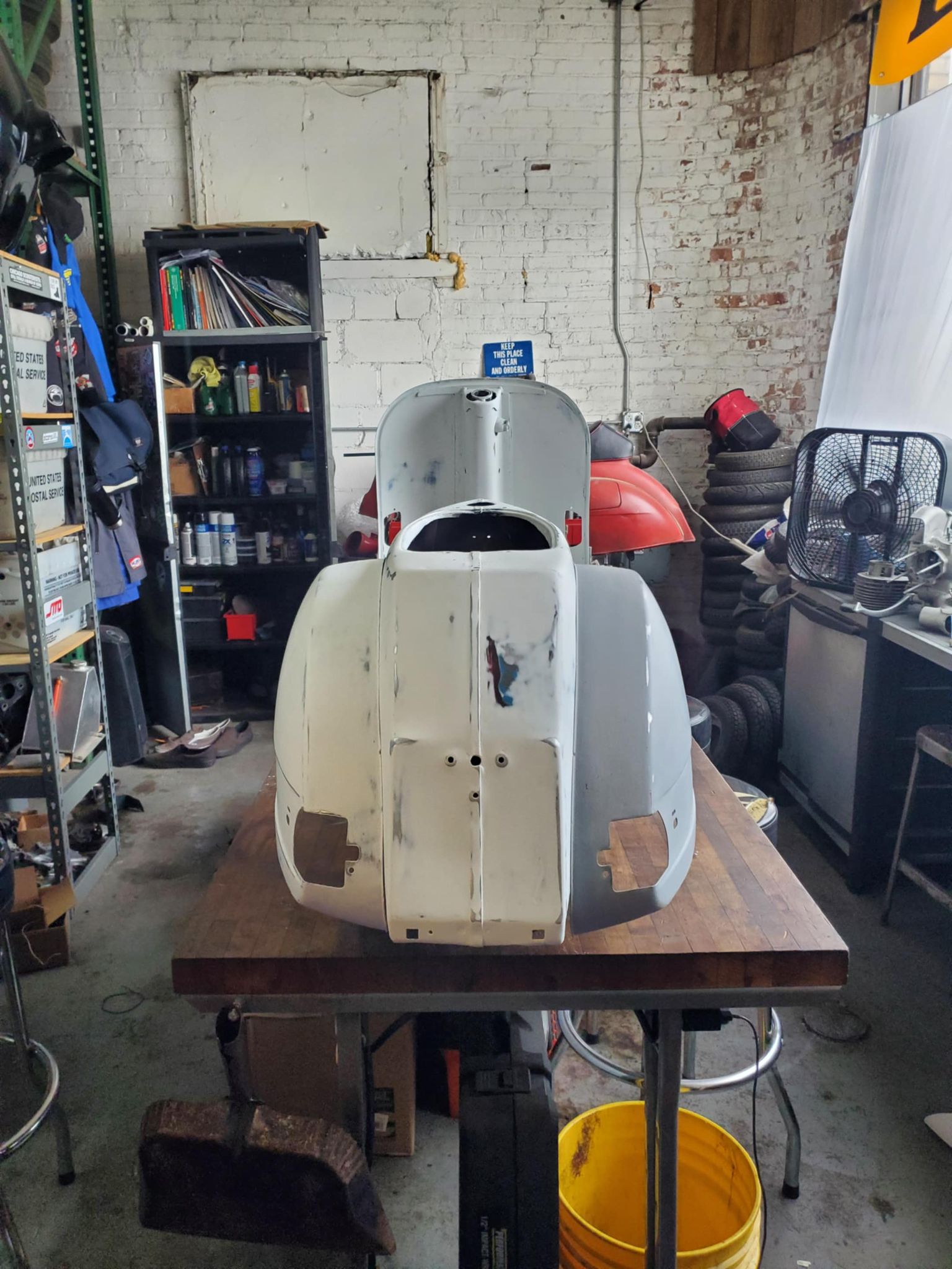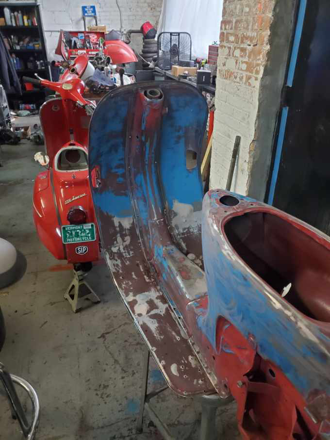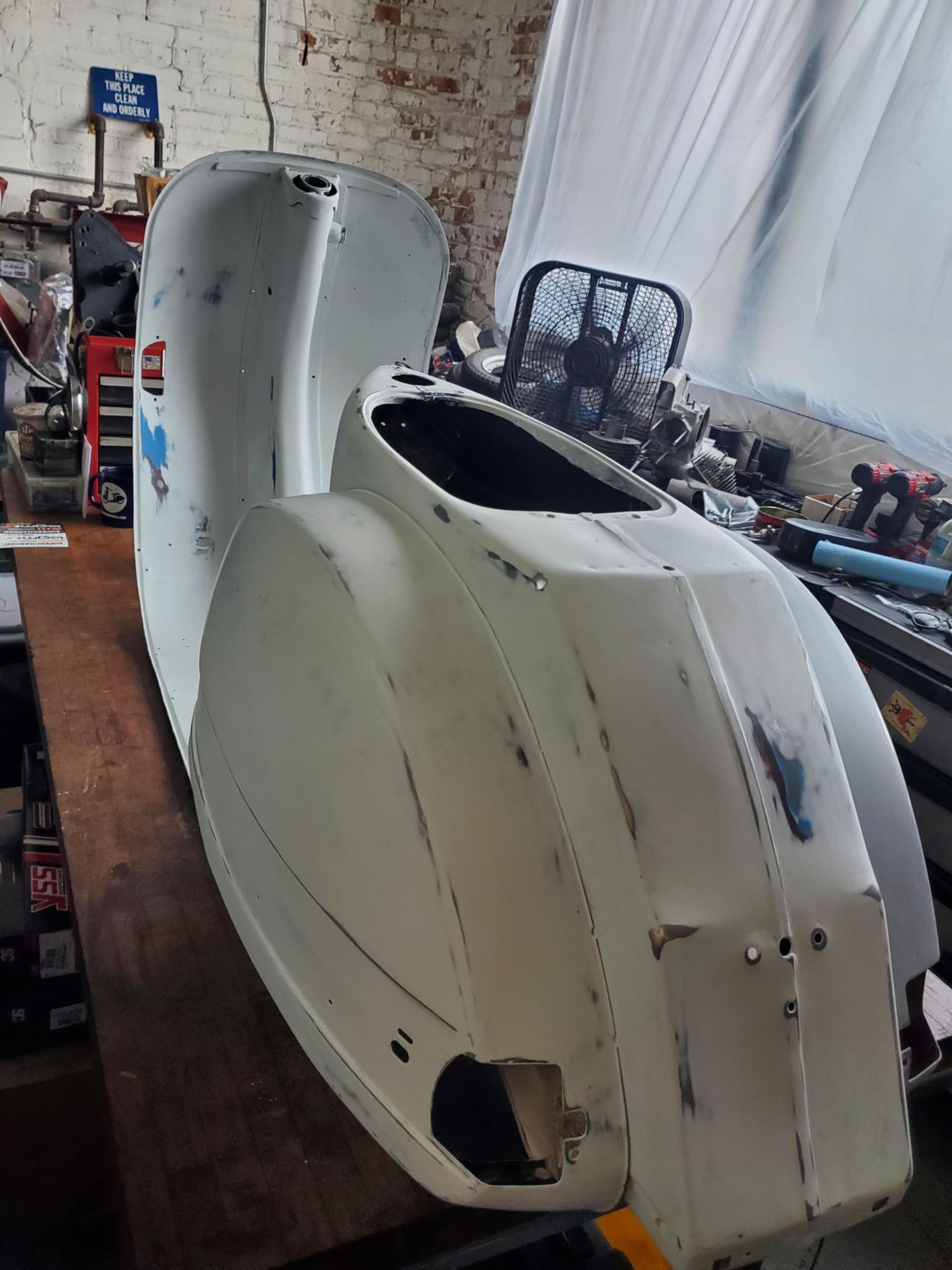 Where’re we at? With about a month to go, Ken at Vintage Scooter Centre has all the bodywork done and the frame is primed and ready for paint. It’s looking really good, Ken doesn’t mess around. We’re expecting some engine photos soon! Keep checking back or follow us on instagram for progress!