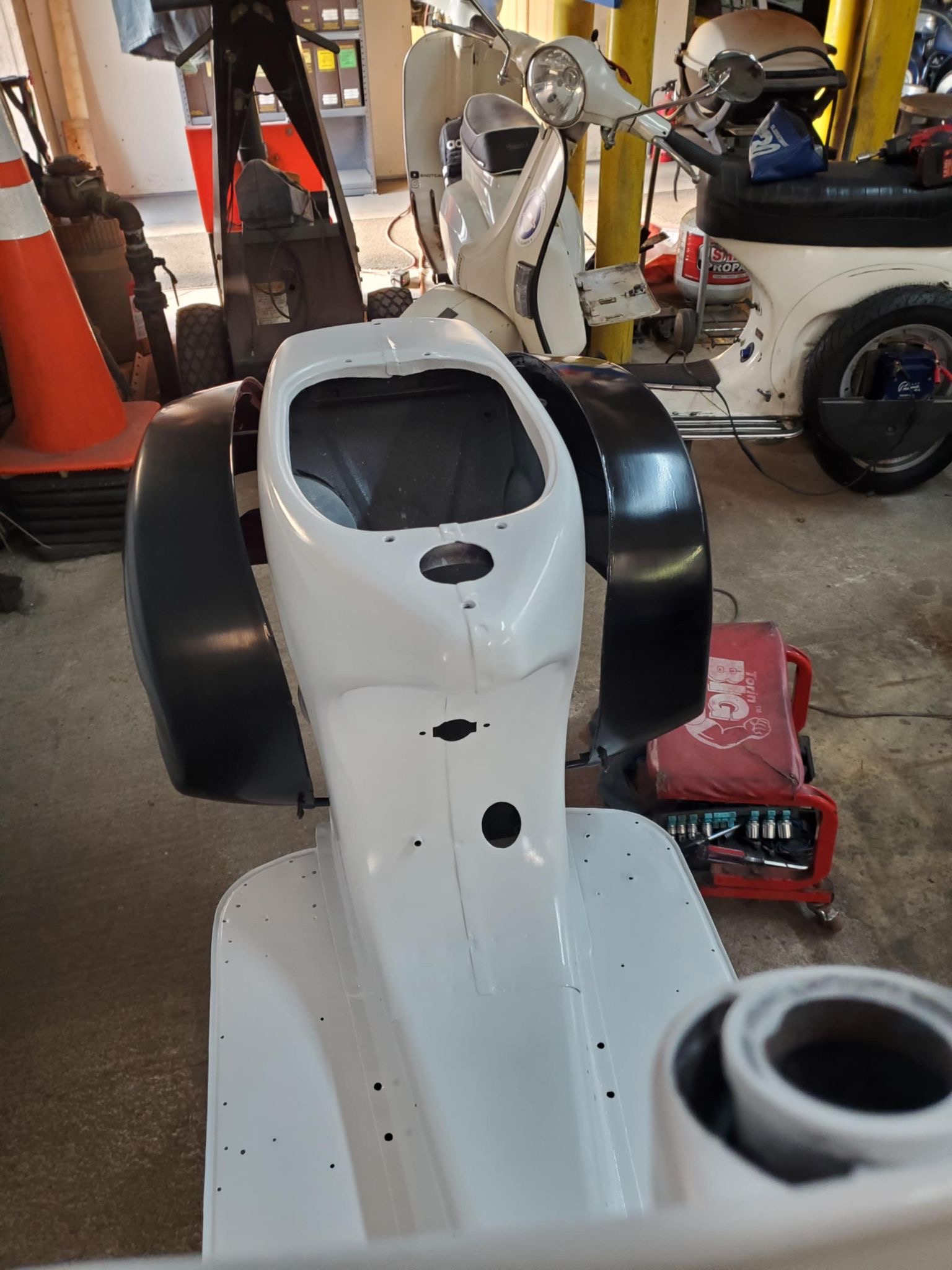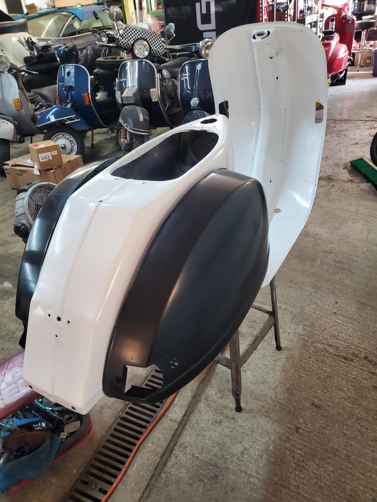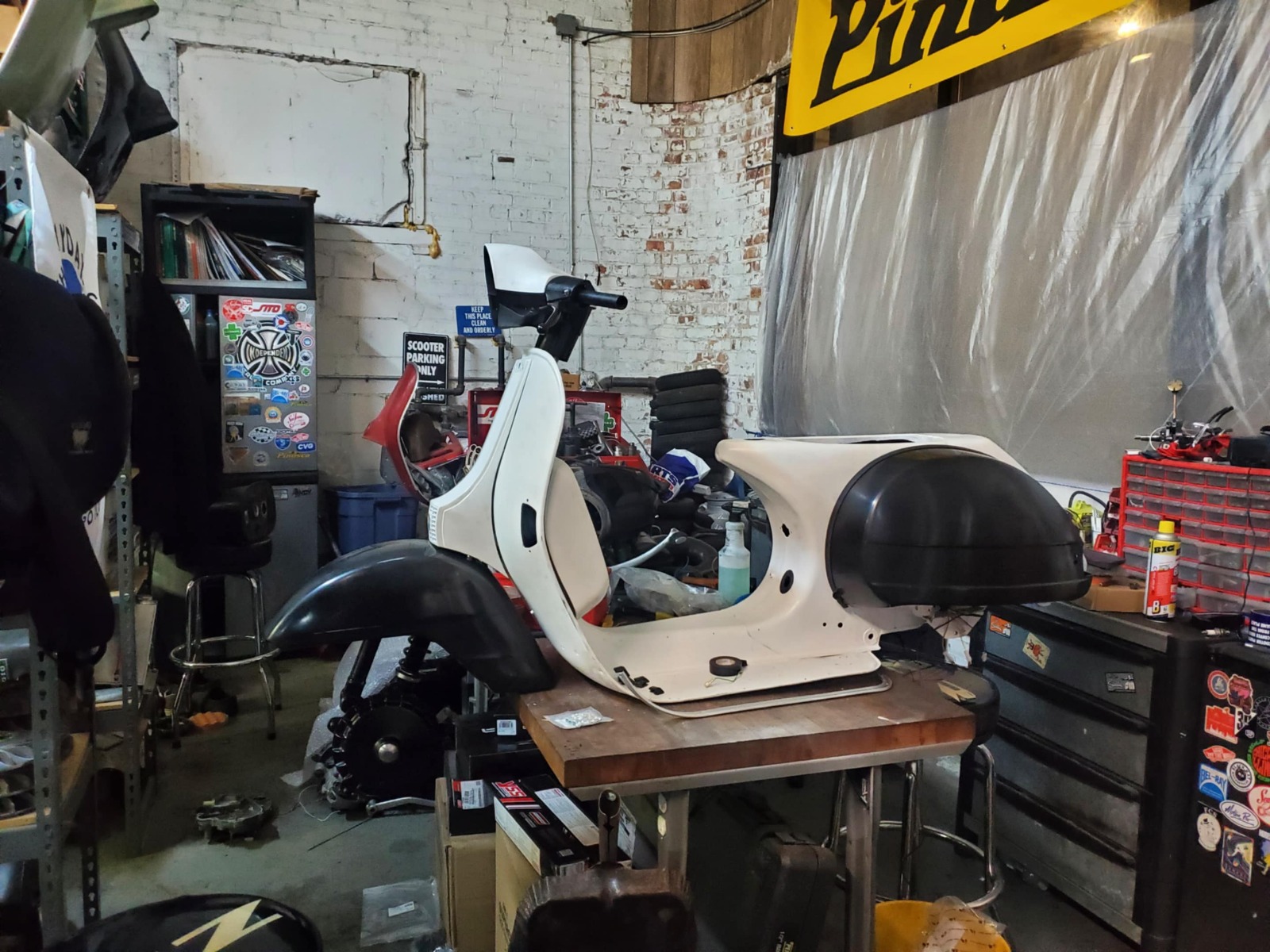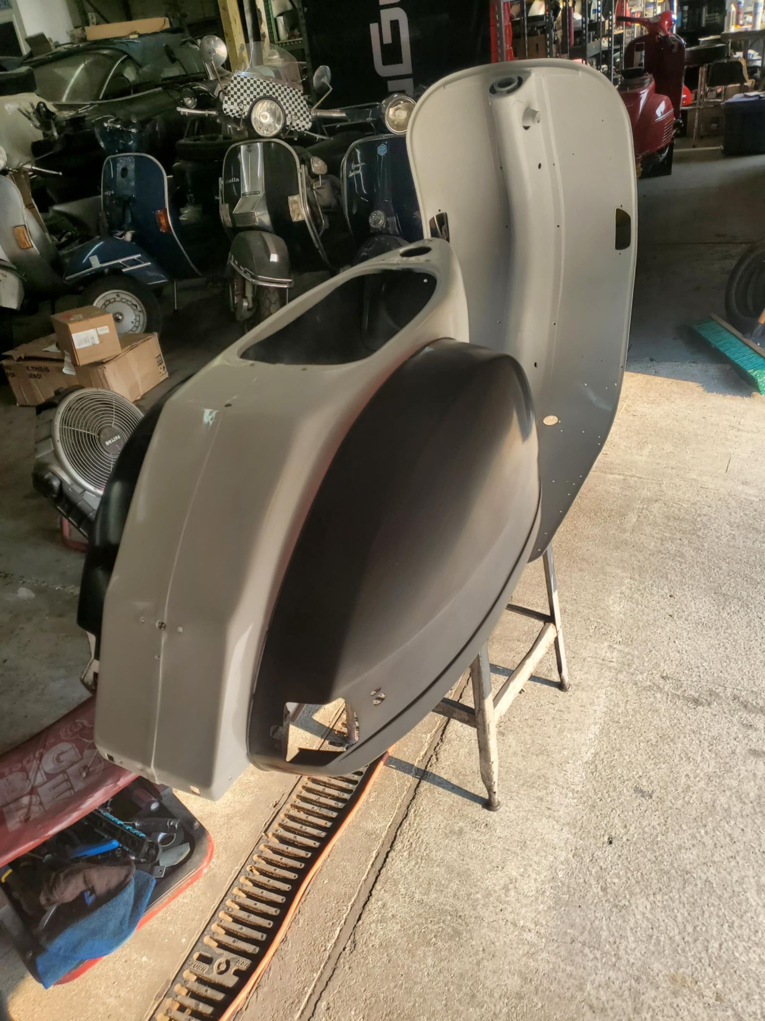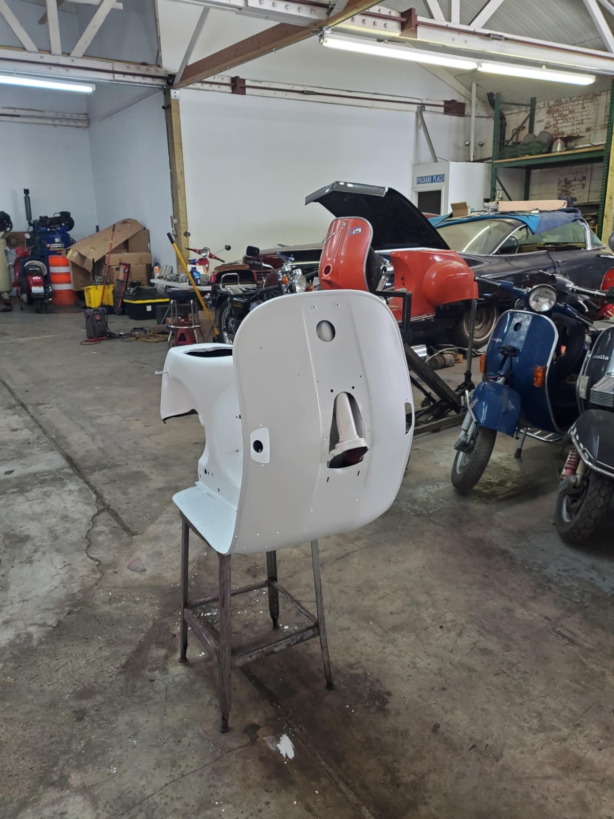 Where’re we at? With about a month to go, Ken at Vintage Scooter Centre has all the bodywork done and the frame is primed and ready for paint. It’s looking really good, Ken doesn’t mess around. We’re expecting some engine photos soon! Keep checking back or follow us on instagram for progress!