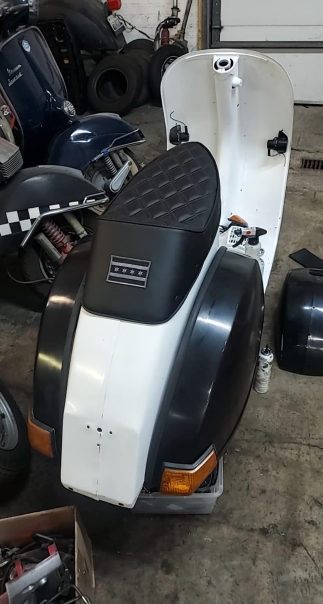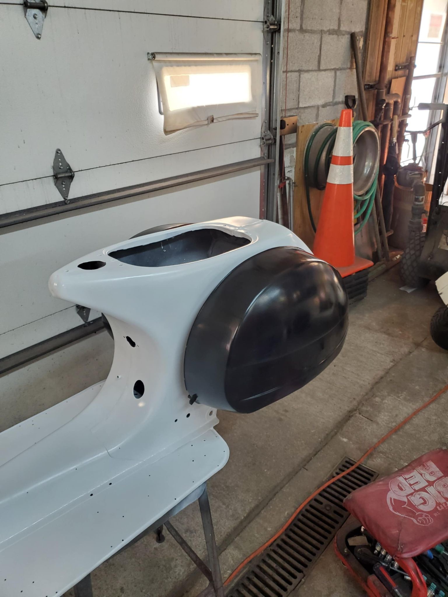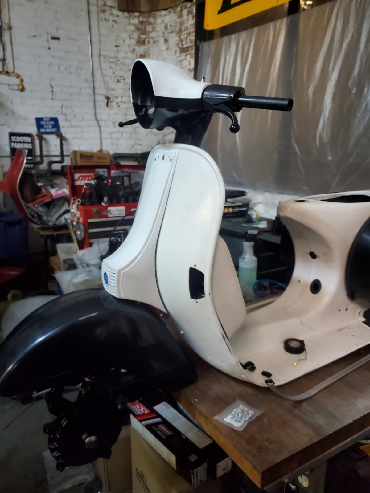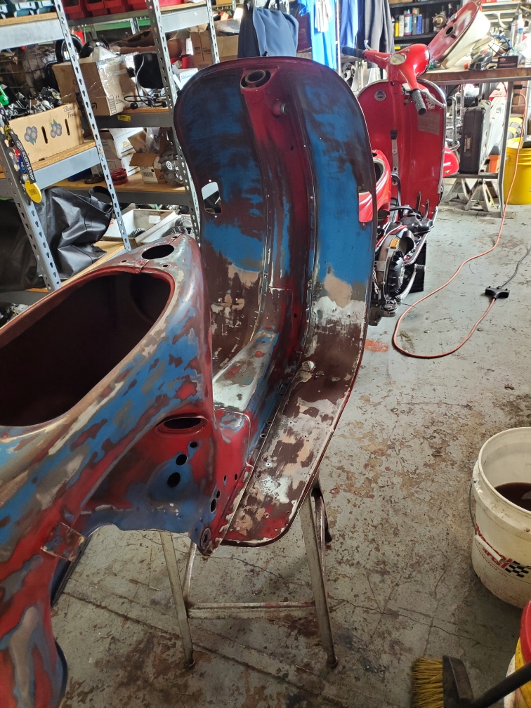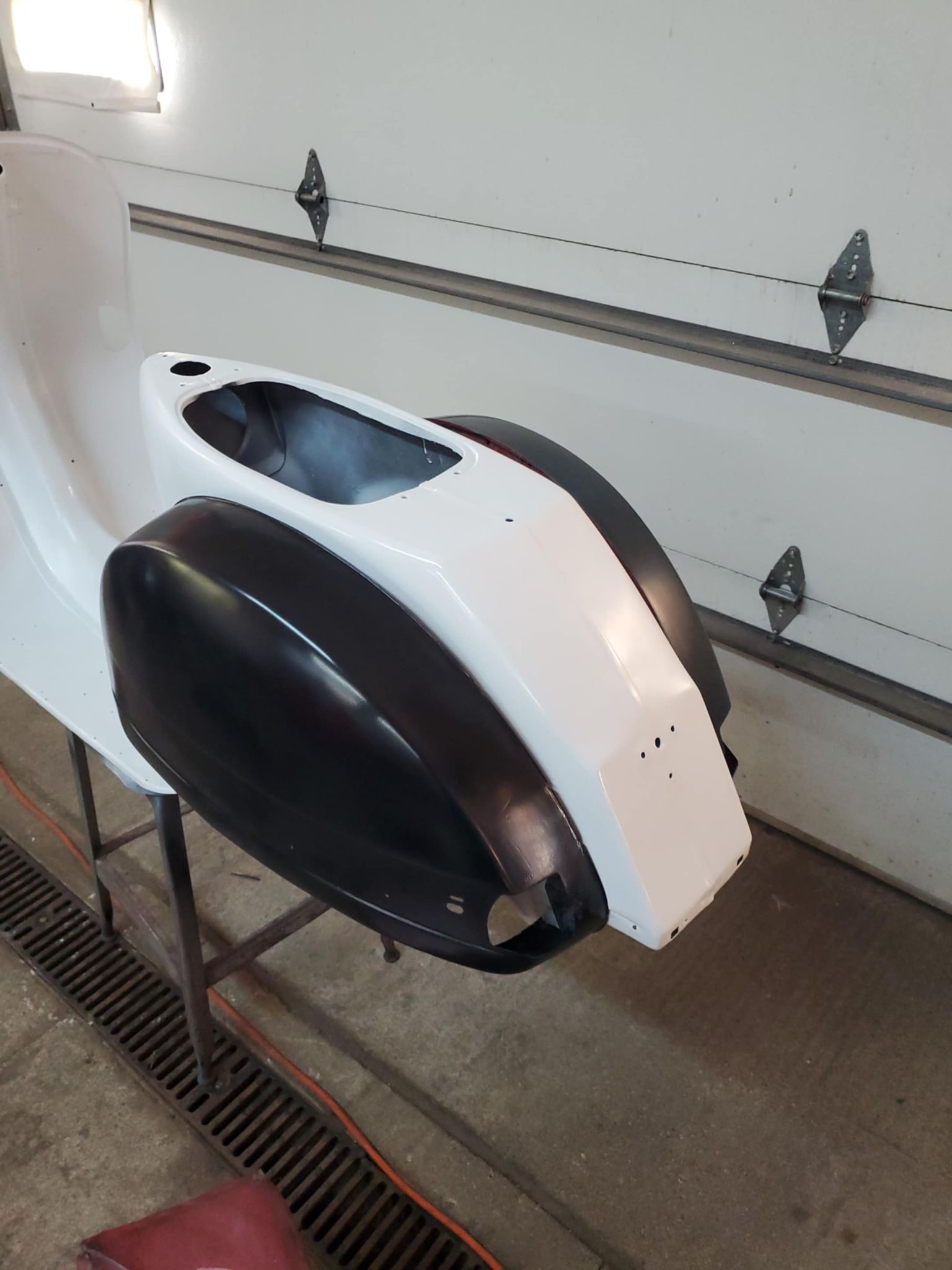 Where’re we at? With about a month to go, Ken at Vintage Scooter Centre has all the bodywork done and the frame is primed and ready for paint. It’s looking really good, Ken doesn’t mess around. We’re expecting some engine photos soon! Keep checking back or follow us on instagram for progress!