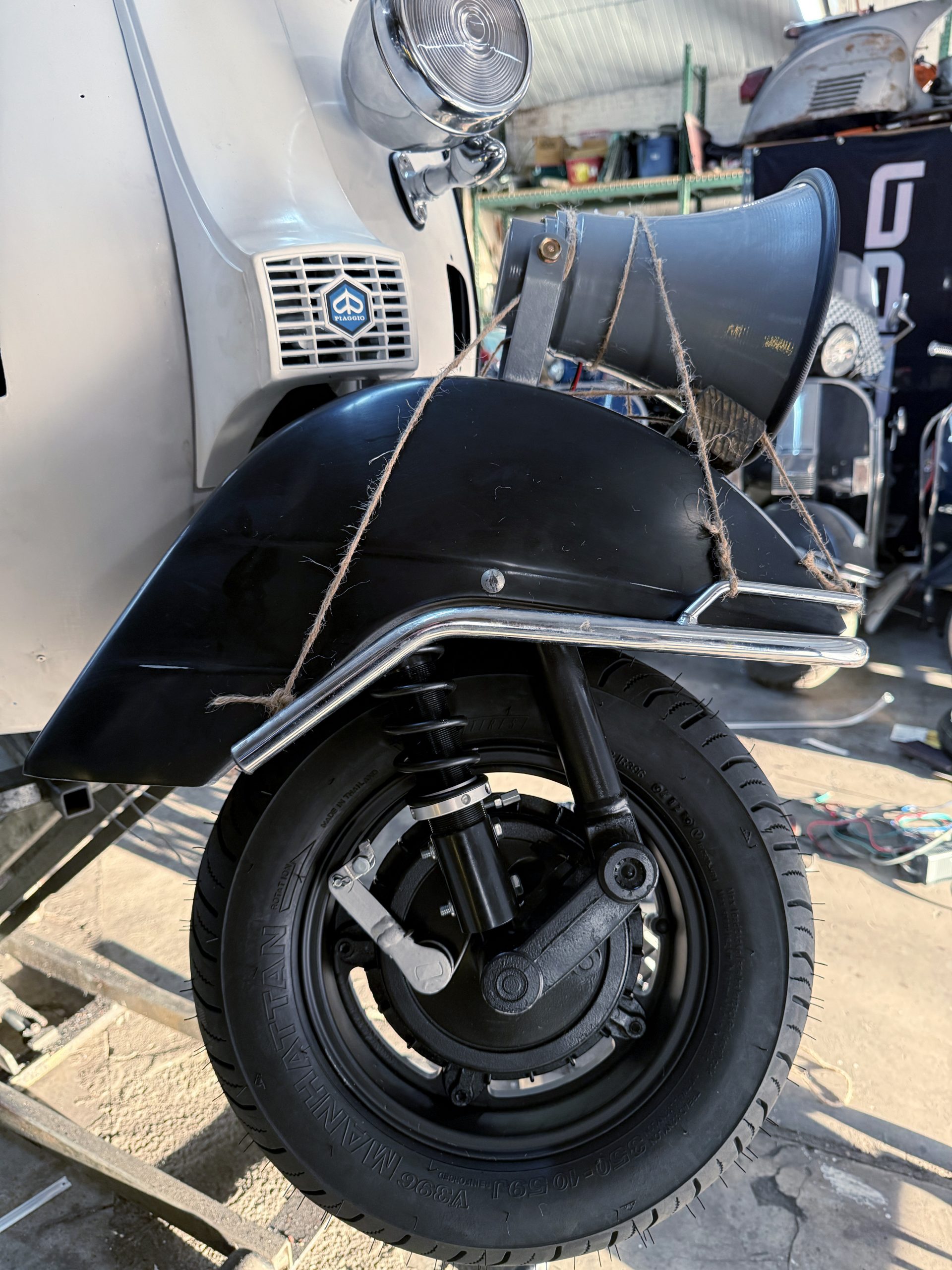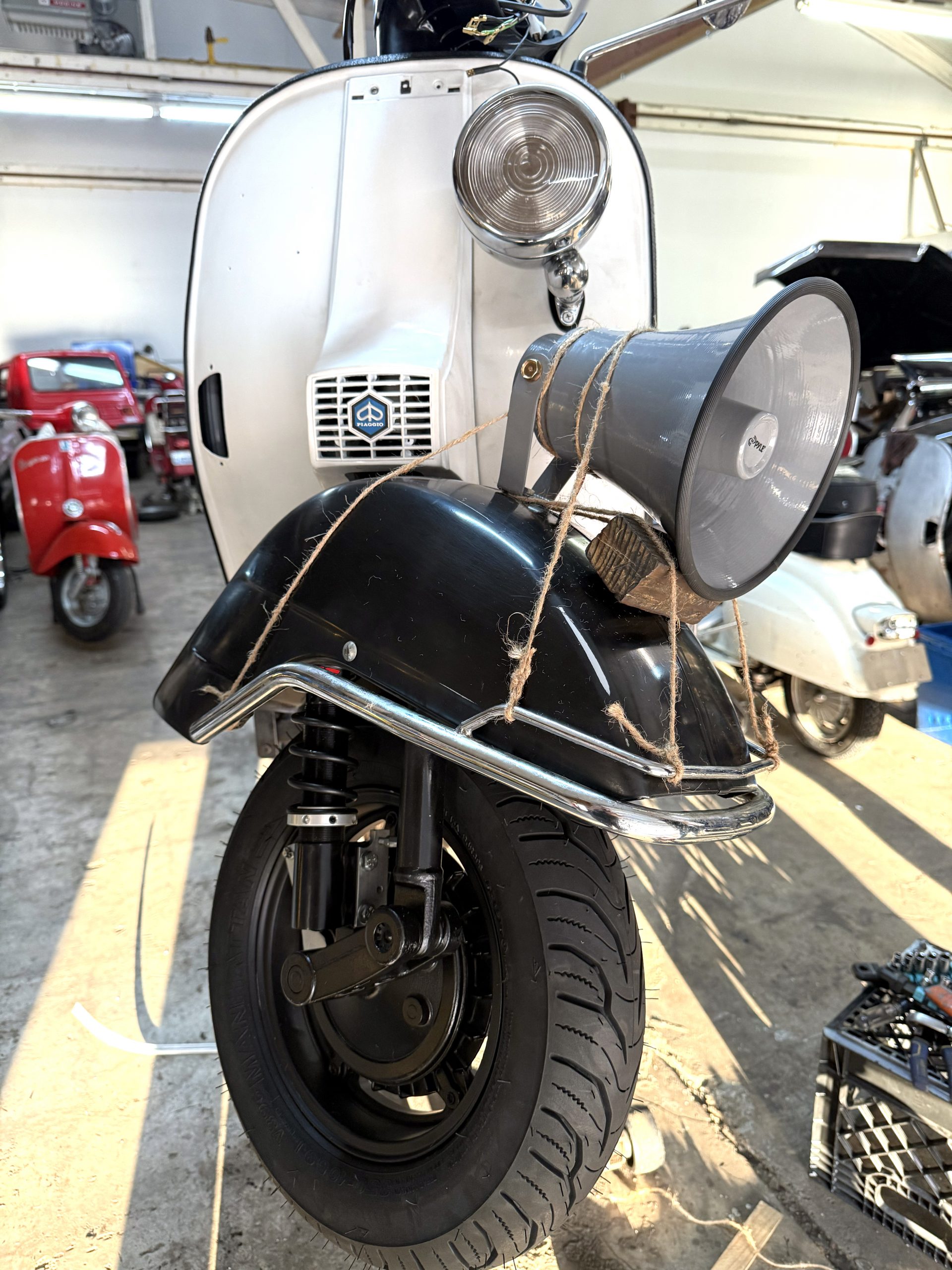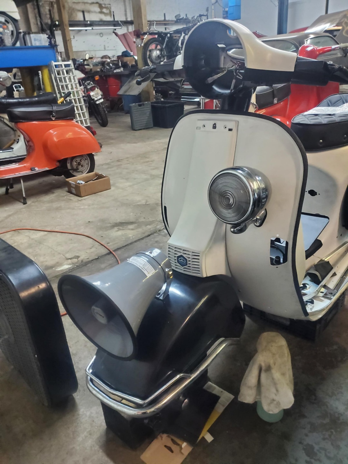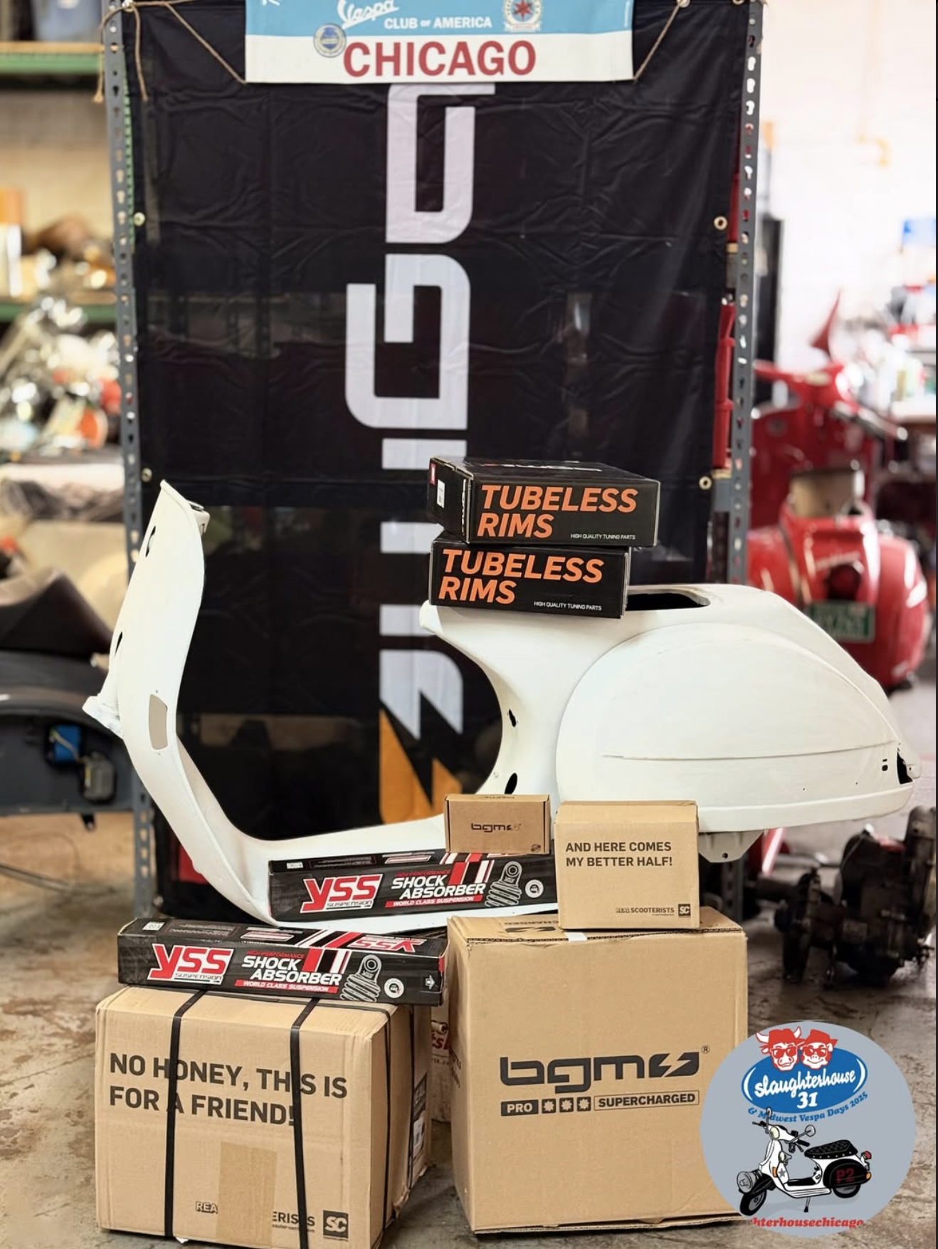 We’re thrilled to once again offer an amazing customized raffle scooter at Slaughterhouse. The Bluesmobile is being built right now by the mighty Vintage Scooter Centre/Chicago Vespisti Garage, with help from the Slaughterhouse crew. It’s a 1979 Vespa P200E, disguised as a decommissioned Mt. Prospect police scooter, with all the upgrades listed below, and we even found that cigarette lighter Jake threw out the window.